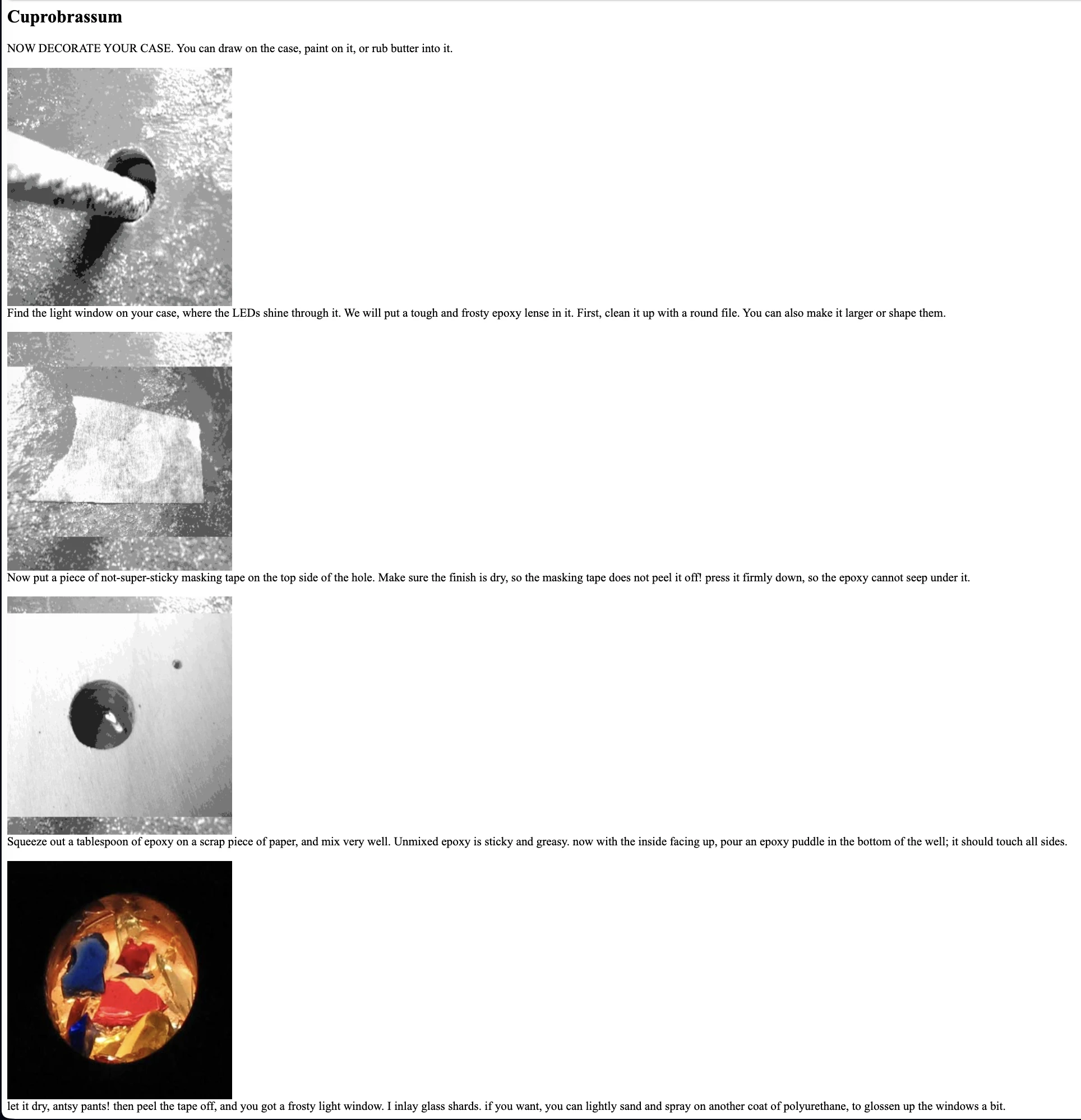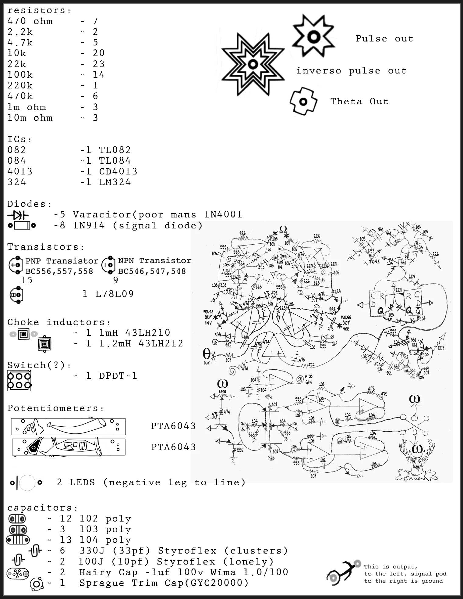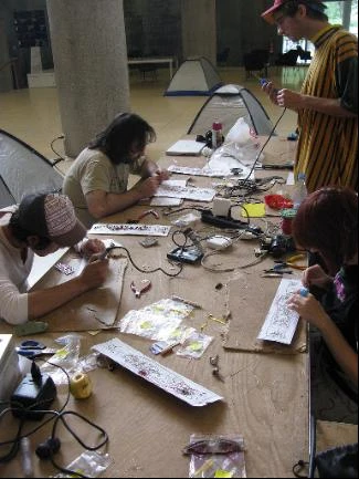 On paper circuits, from Peter: "PAPER CIRCUITS In 2006 I began making circuits on paper. Paper circuits are easier, cheaper, and environmentally safer than the alternative- greenboards etched with heavy chemicals at a factory. The idea, which I got from a St. Louis collective known as “commonsound”, puts front (component) face and back (trace) face adjacent and mirrored on the paper. The pattern is cut out, folded in the middle, then pierced with a needle. The components are inserted and their leads woven and soldered according to the trace pattern. I created several pocket-size paper circuits that explore touchability and the complexity of circular modulations. I play them by intuitively wiring or touching nodes to each other to create different re-weavings of the internal circuits. I consider these the most accessible of my designs; anyone can salvage or buy the components after downloading the plans from my website (www.ciat-lonbarde.net). Each build of a paper circuit is unique, because the time elements vary by changing values in key locations. The transcription of electronic ideas onto paper stimulates a free and open distribution of craft, where the final pieces vary based on the skills of the maker. This appeals to an ideal of medieval individuality, where information is distributed personally through guilds as well as mnemonically in spellbooks and mandalas. The paper circuit projects attempt to bring the art of electronics from an impersonal, industrial approach to one which is individual and magical. This crafty use of electronics encourages everyone who pursues it to personally reduce waste; creativity leads to resourcefulness and vice versa."