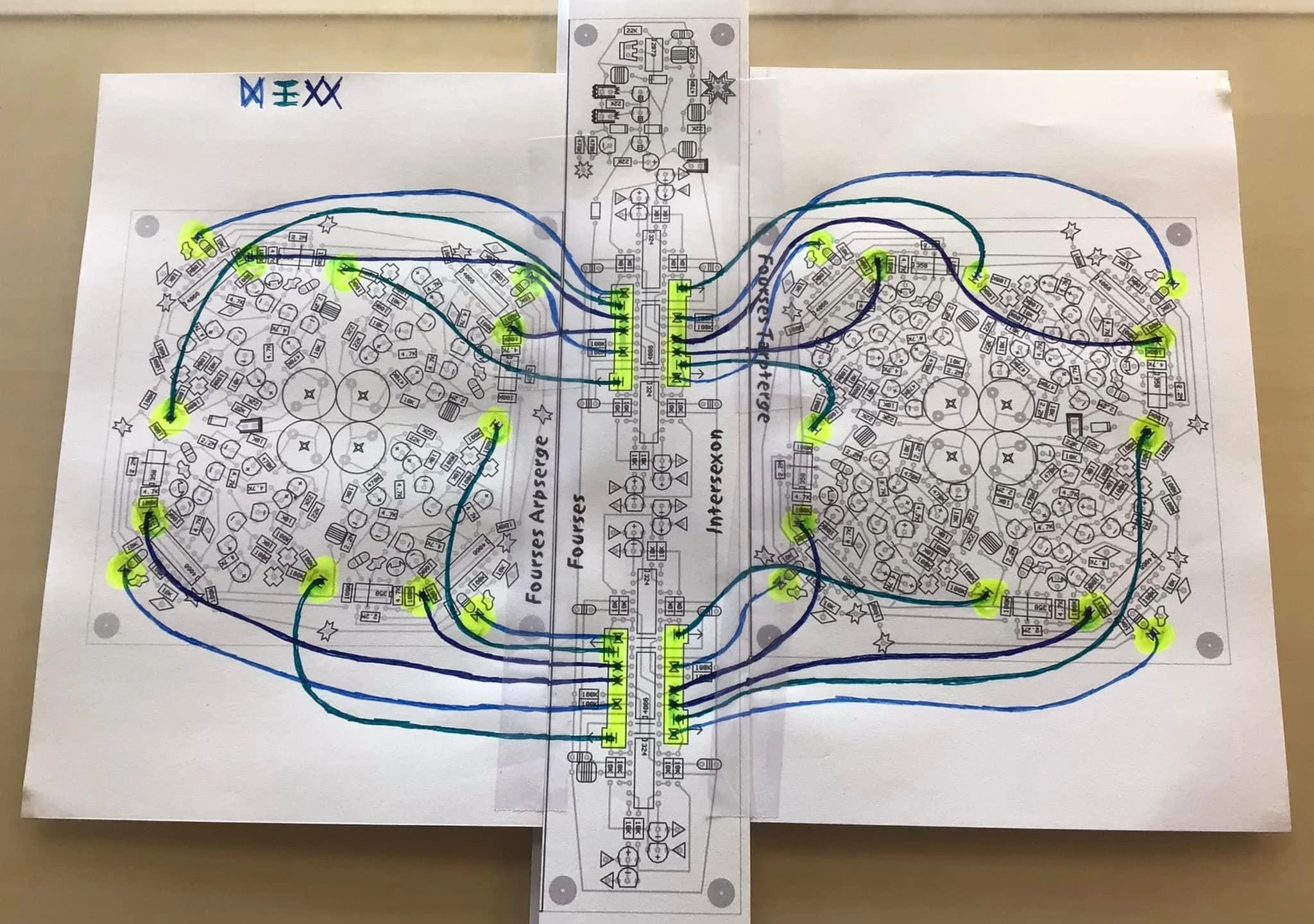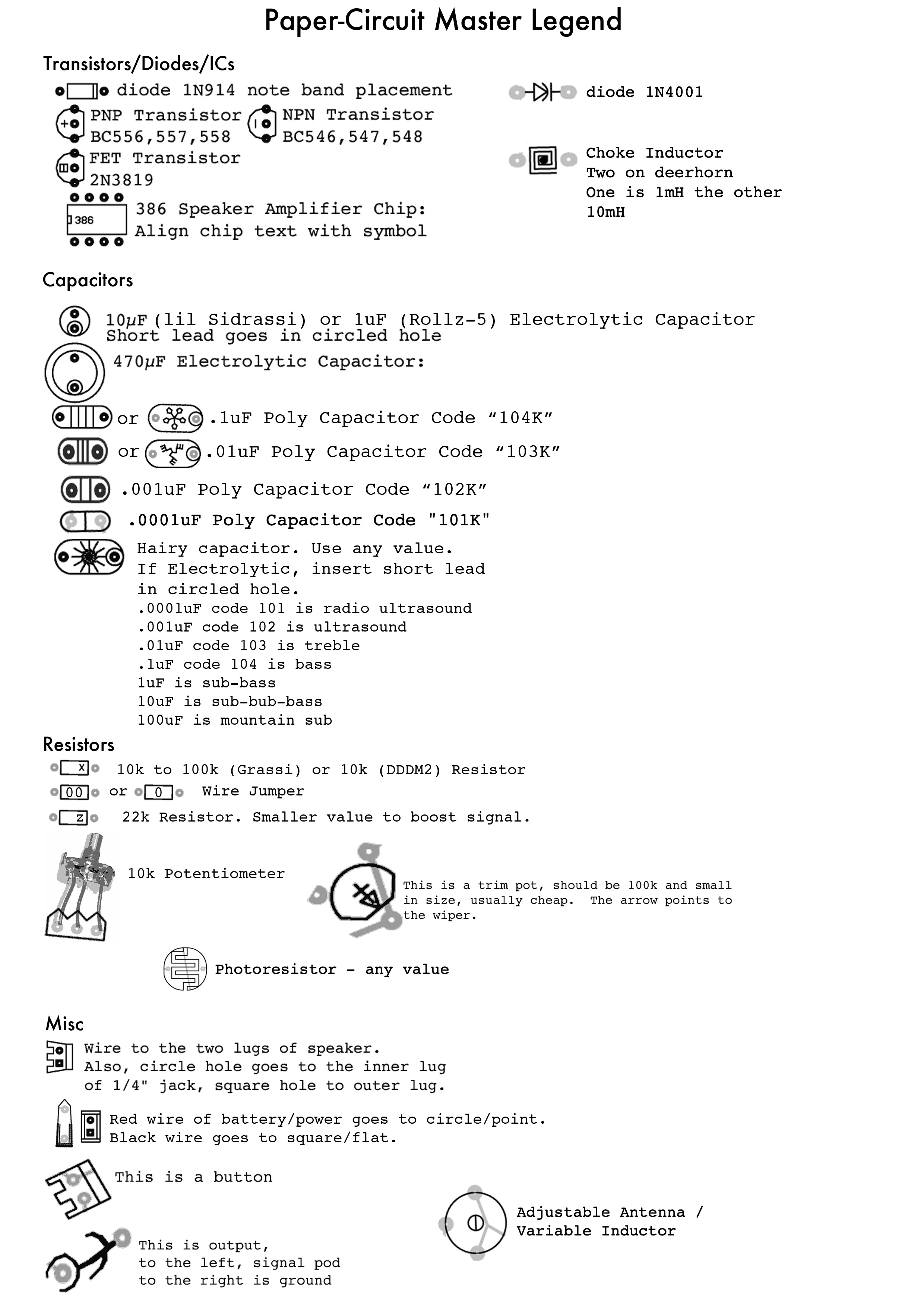 Peter's circuits are like ancient foreign ruins, with many cryptic symbols and strange geometries. A lot of his circuit designs are influenced by geography, sound in nature, touch, gesture, wind and everything in-between. The master legend demystifies his paper circuits, and allows you to put these puzzles together relatively easily.