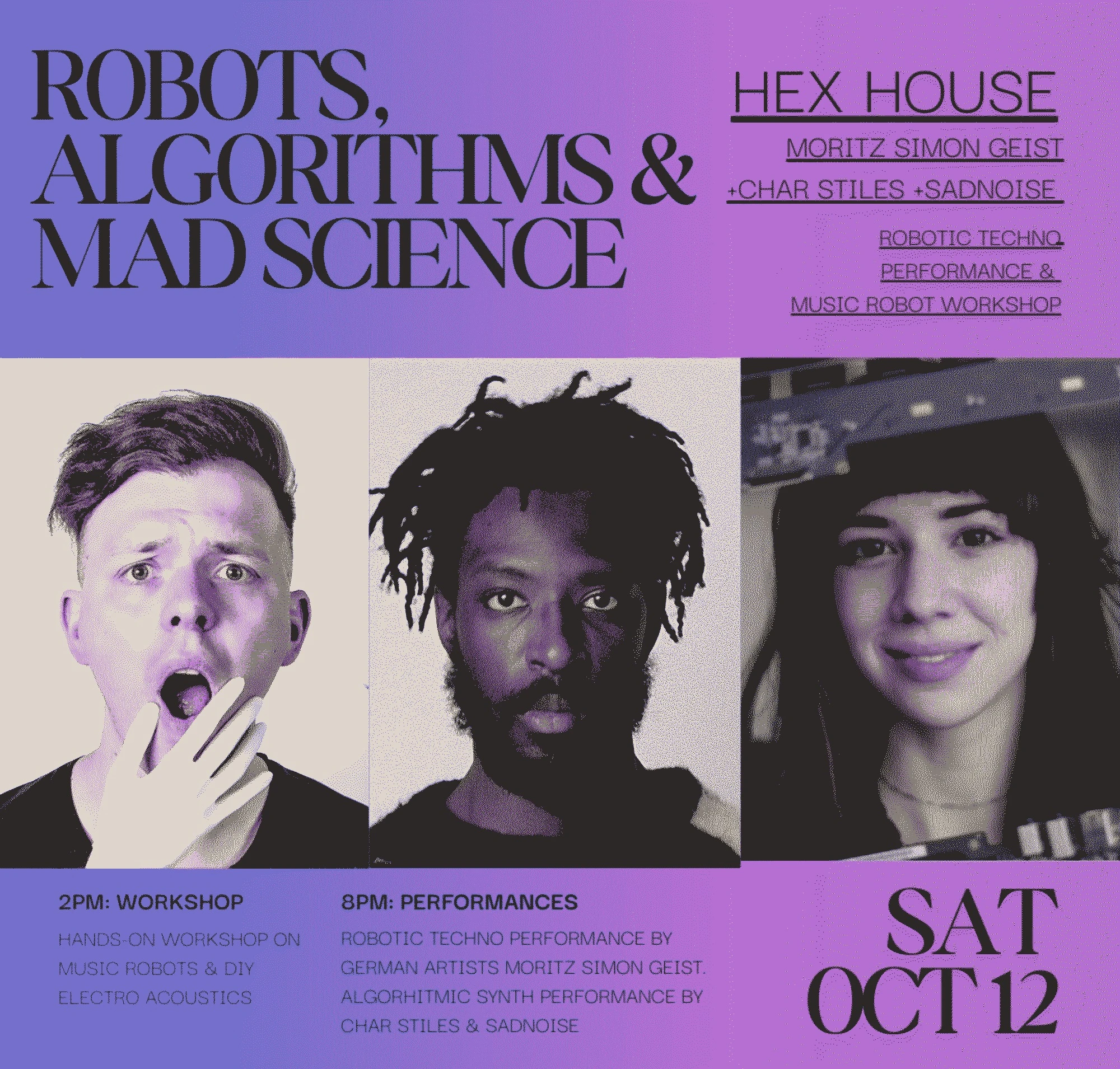 A night full of Robots, Bass An Algoritms! German artist Moritz Simon Geist brings his robotic techno performances to East Williamsburg on his US fall tour. Known for creations like the Popcorn Jazz Robot and Robotic 808 Drum Machine, Moritz will transform Hex House into a mad science lab! Char Stiles is a computational artist, educator, and programmer. She works creatively in the lower levels of graphical computational systems & makes jokes about how computers work. She is currently at the MIT Media Lab’s Future Sketches group researching the future of creative coding in performance. Sadnoise is all about Internet data ambience esoterica, music for digital gardens and binary sandstorms. Workshop: Earlier in the day, Moritz will host a hands-on "Robotic Electronic Music" workshop (2-4PM) where participants can build and experiment with DIY music robots. No experience required! Saturday, Oct 12 2PM Music Robot Workshop 8PM Moritz Simon Geist (Robotic Techno live), Char Stiles, Sadnoise