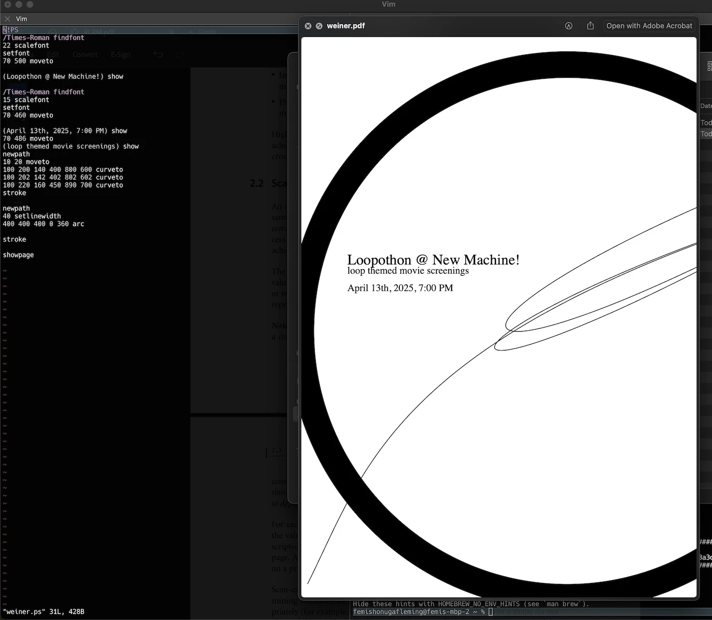 Learning PostScript, a coding language for pdf and page layout design. Dave Fischer useds postscript to make flyers and animate music vidoes for melt banana in the past.