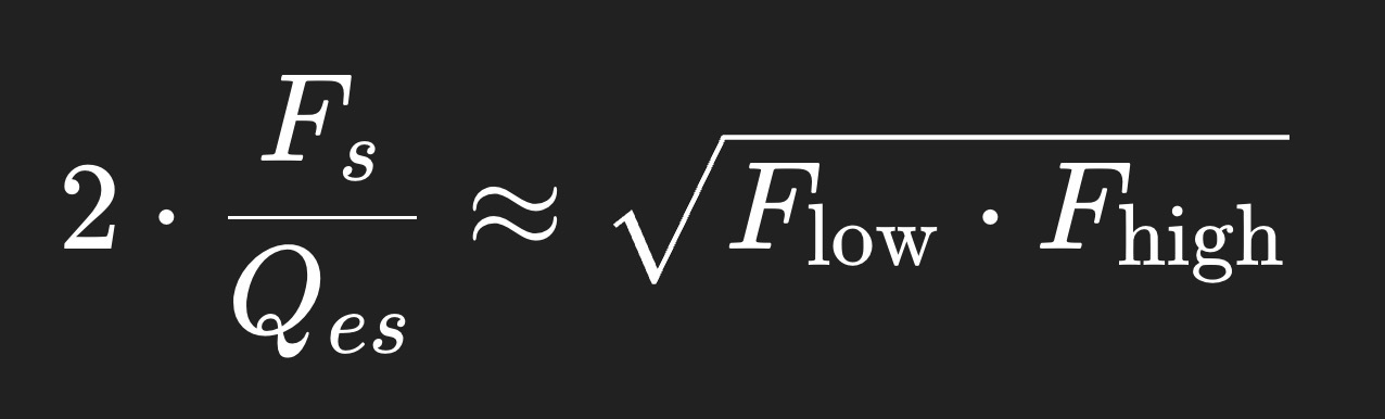 2 * Fs/Qes : This is basically a way to estimate the “effective midrange frequency” of the driver when placed in a bandpass system. A driver with a higher Fs or lower Qes will push the bandpass center freq higher. Multiplying by 2 is part of the empirical adjustment to line it up with the geometric mean of the desired bandpass.