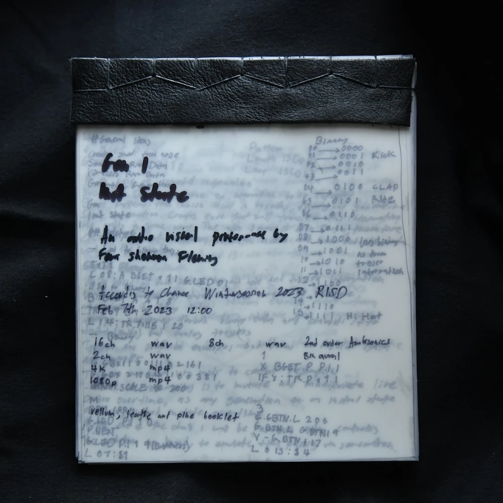 All sound sources used in this work are comprised of simple waveforms and white noise. This piece was preformed on February 8th In the Digital Media building at RISD. The piece was performed in 2nd order ambisonics on an 8 channel Genelec speaker array using Reaper, IEM plugins and a Korg Nanocontrol. All recordings of this piece are binaural for stereo listening. Monome Teletype provided all binary pattern and rhythm generation, and Grid was used as an interface for controlling various teletype operators.