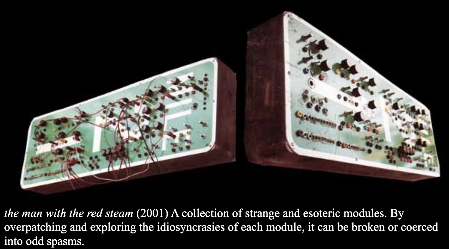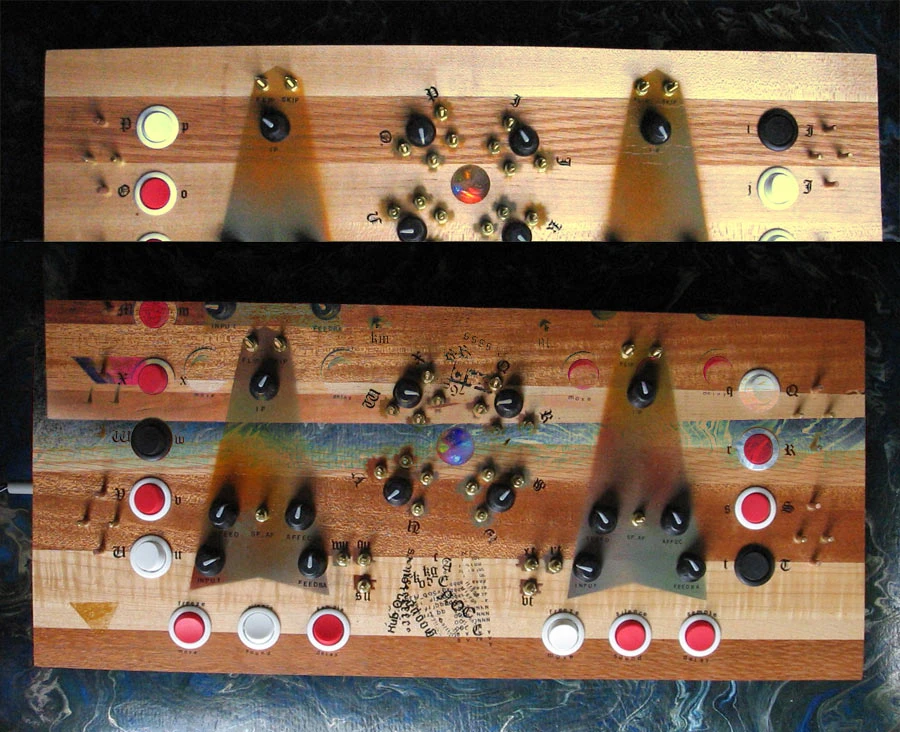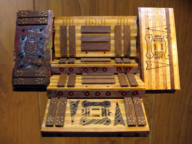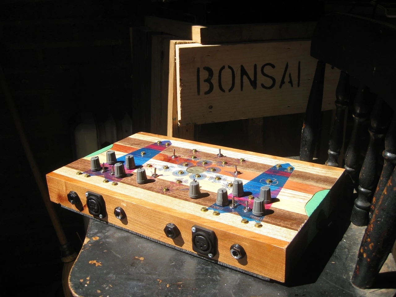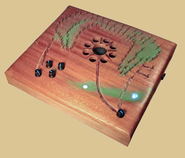 Peter Blasser, the egongs, 2001.Hand drawn circuits installed on eastern red cedar.