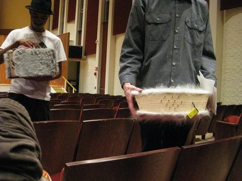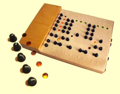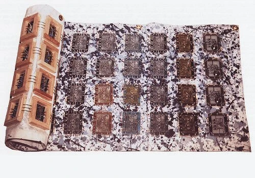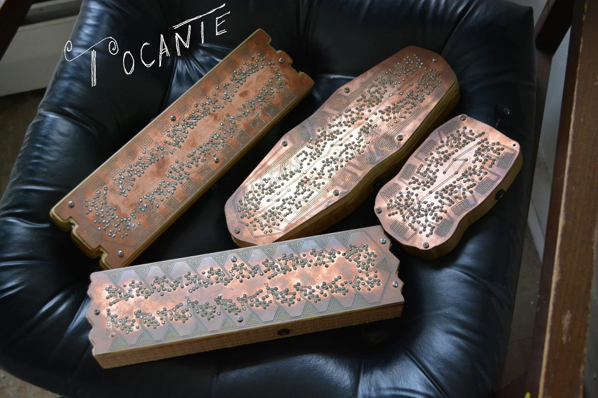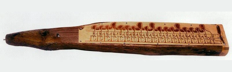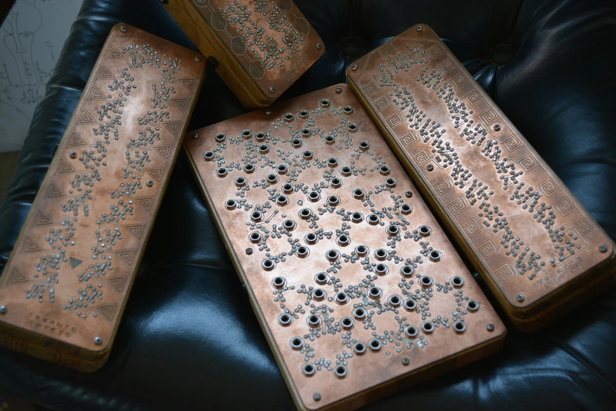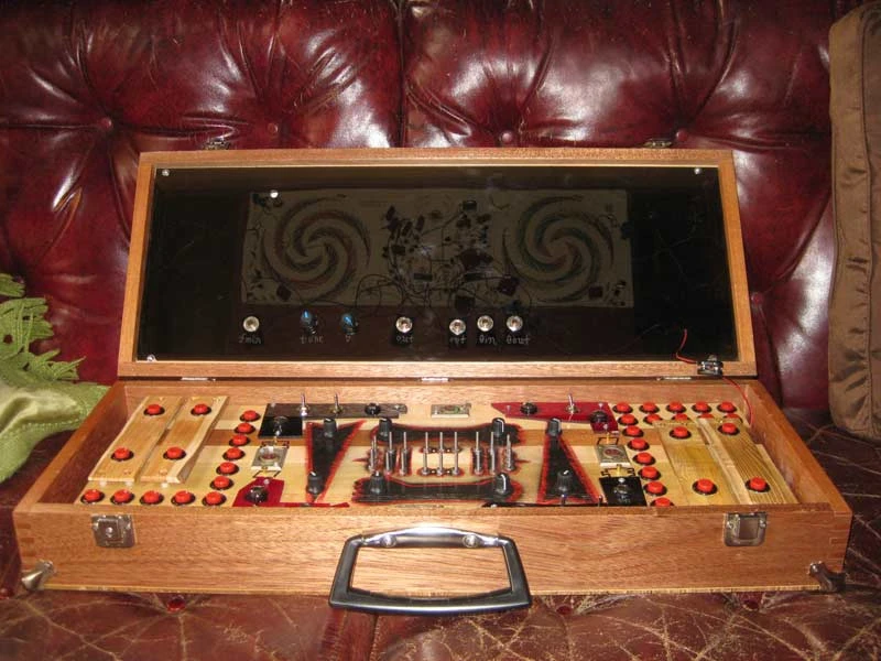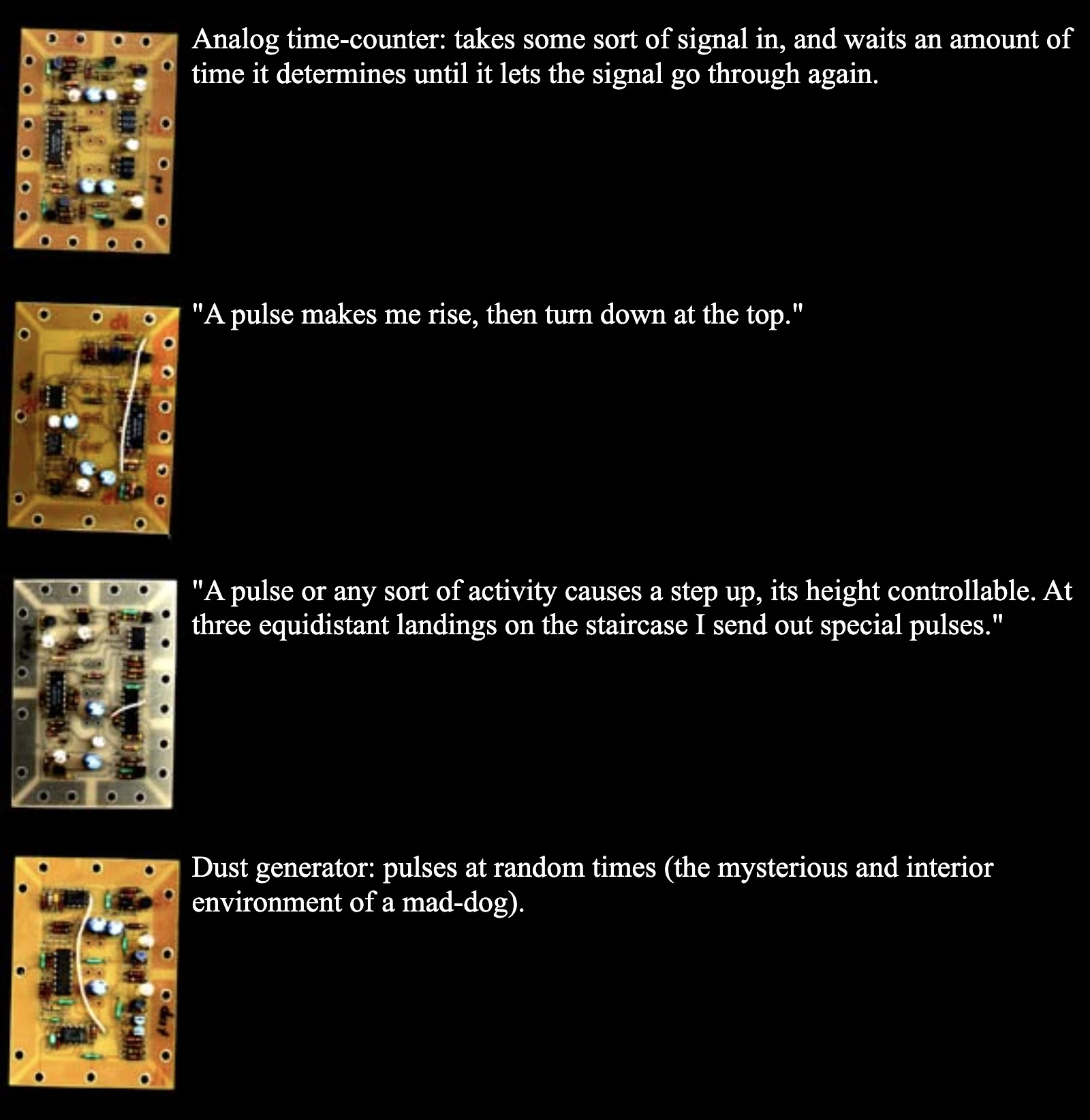 Peter Blasser, the egongs, 2001.Hand drawn circuits installed on eastern red cedar.