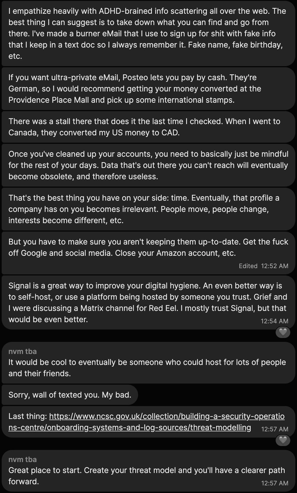 does anyone have any good resources on digital hygiene? I feel like with all the scramble to suddenly be using the internet differently (divest from meta, start new forums/social media) it's got me realizing how scattered and all over the place my data and attention are. it's especially hard on us adhd-types