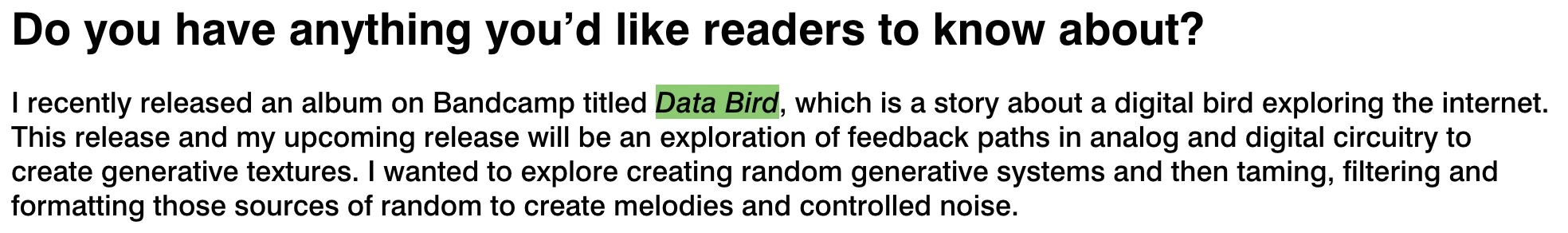 | Data Bird | Album, WAV | Yuka Annabelle-Tamura | 10 |