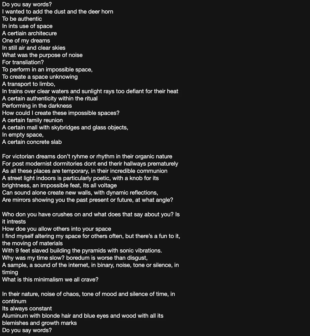 - 1. there is autonomy in the creation of strung out intertwined dandelion stems, there is no hope in the spiral of pedals, underneath the towering blades of marble grass 16:06