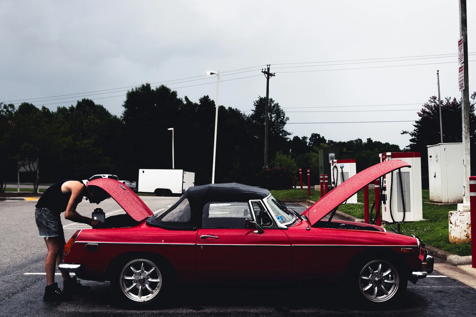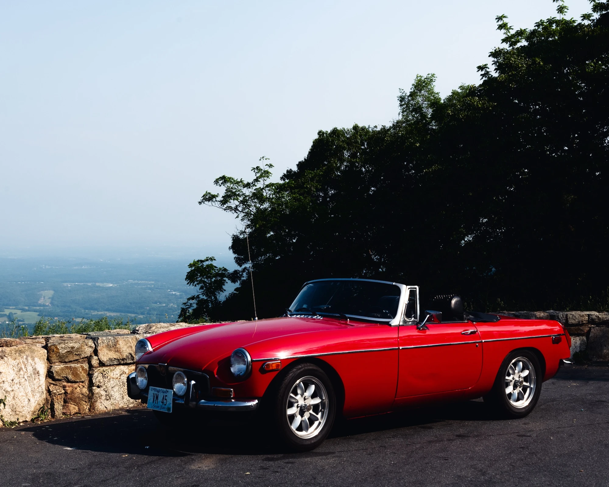 On June 5th, 2025, Me and Enzo left for Georgia in his 1973 MG B That he had just finished restoring, building the engine basically from scratch. The engine had about 550 miles on it before we embarked on our journey, and 3573 when we returned to providence on the 10th. The car did very well on the trip, there was a tiny leak from the back seal of the break fluid tubing, and at one point the fan belt became a little loose (which we fixed on the spot). We watched the weather for the radar and listed to the local weather radio, outran a few thunderstorms and baked in the heat for the first couple days. We swam in a lake, river ot beach for at least the first 3 days to cool off. We made stops in Torrington, Stony Point Beach, Gettysburg, Front Royal (Along the beautiful Skyline Drive, with the highest elevation being 3600 ft), Eastover, Dillon, and Georgetown before finally arriving in Savannah. That night we walked along the dock near the water in the fancier part of savannah, lots of candy shops and restaurants along the active port. Some of the boat port buildings had been converted into malls. We watched the lightning in the storm we escaped for a while, past the cranes moving shipping containers, while Enzo explained to me the precision and skill needed to operate these big huge cranes carrying tons of weight. We also talked about tug boats and radioactive material. We went looking for a diveyer bar and ended up at Dew Drop Inn in Forest Ridge. The bartender lady talked about her experience at Woodstock 99 and confirmed everything I heard about it was true. We ate a couple weiners that had been sitting out in one of those dog heating machines at the bar, two weiners per bun, and booked it to a motel in Dublin, where a drunk man in a Trump shirt surrounded by 4 or 5 dogs told Enzo the MG was "running a lil rich", which ended up being true, before directing us to the motel we were actually looking for. On the journey back we also stopped in Athens, Tallulah Falls and slept at our friend Tristain's cottage in Highlands (with a max elevation of around 4000ft). The hight difference took some getting used to. Highlands had a really creepy vibe to it, like the whole town had been haunted and rebuilt after some tragic disaster. All the buildings in the main city looked brand new, as if they were built in the last 5 years or so. We finally stopped in Danbury, where there was an abandoned greenhouse behind the gas station, before arriving in providence on the 10th at around 11pm.