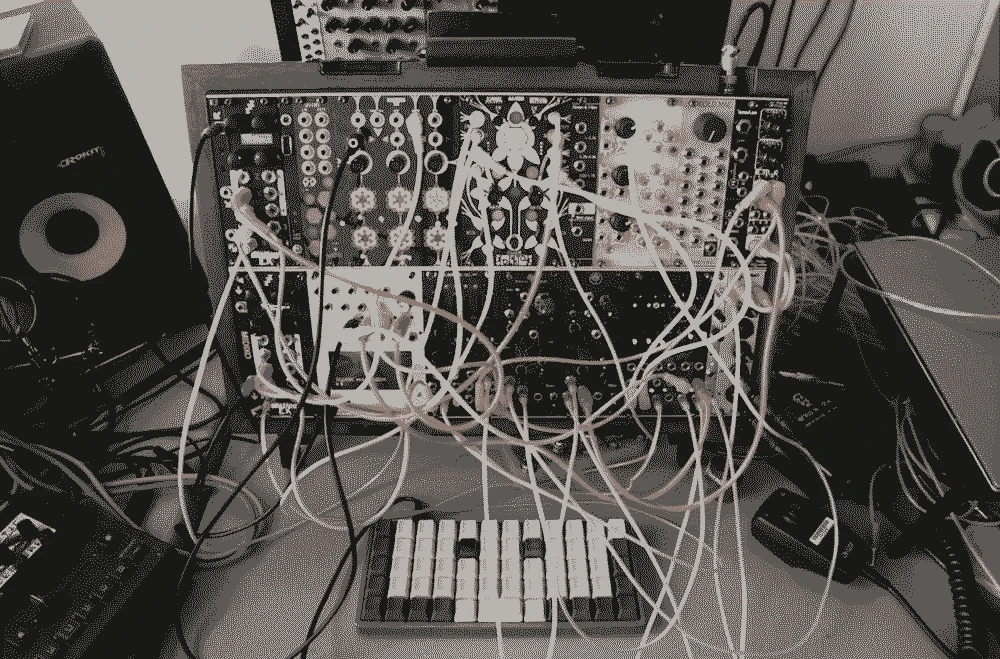 This is my custom keyboard. I use this keyboard with the Monome Teletype eurorack module. It's the OLKB Preonic with an aluminum body. It has a custom keyboard layout. The keycaps are PBT and solid walnut. The switches are clicky, NovelKeys Sherbet.