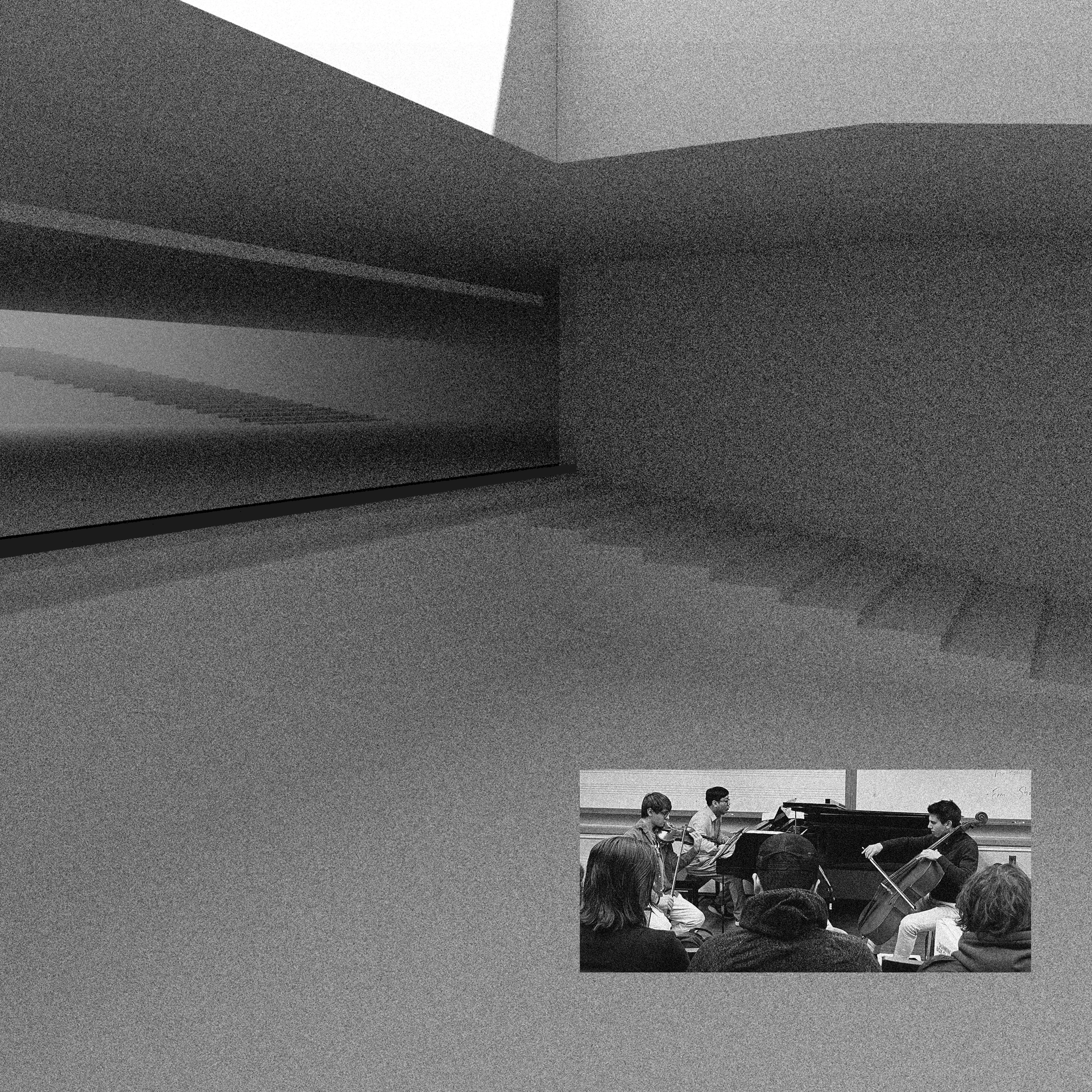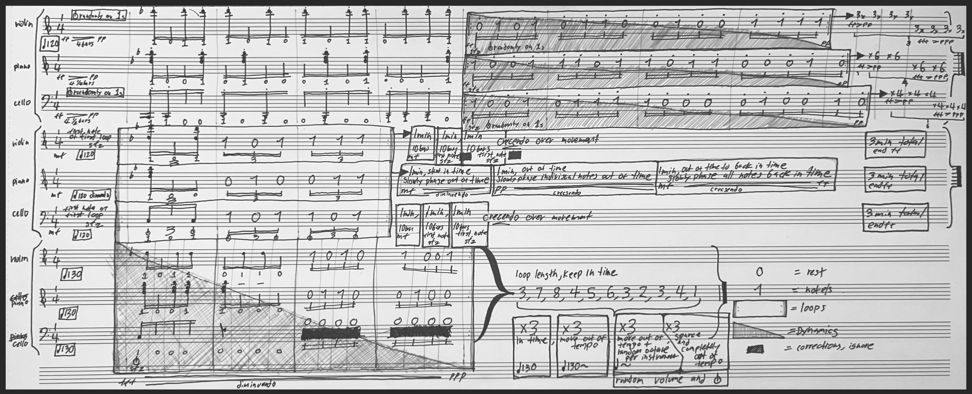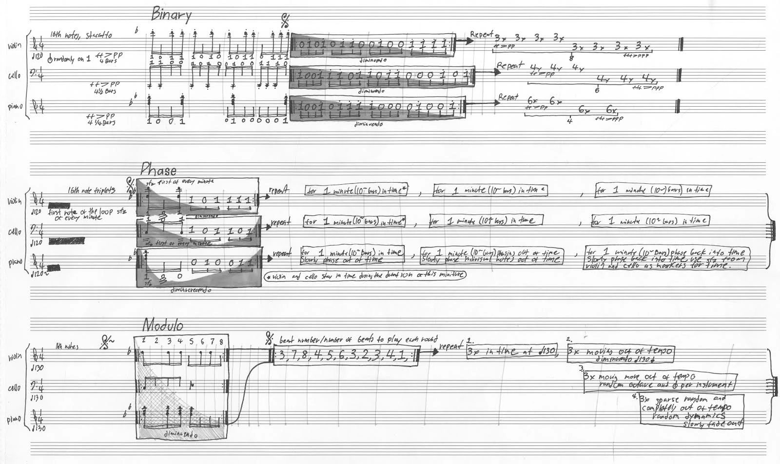 This score is based off of binary information generated by randomly sampling values of noise from a recording I made of the environment of a highway underpass at 41 814011, 71 406527 in Providence, RI Each 1 in the score represents playing a 16th note or chord, preset at the beginning of the movement, while each 0 represents a rest. In the first movement the first 4 bars are a notated representation of playing notes on 1s and resting on 0s. The next 4 bars for violin is a loop, that is to be played 24 times. Within the loop, the grey envelope overlay is a visual representation of dynamics. In the first 12 loops this dynamic is a representation of ff > pp, and in the next 12 loops from fff > ppp. These rules are the same for piano and cello, however the length of the piano loop is 4 and 1/4th bars long, and the length of the cello loop is 4 and 1/2 bars long. These loops will most likely end at different times. The violin is notated as 8 sets of 3 loops to make up 24, the piano is notated as 4 sets of 6 loops each to make up 24 and the cello is notated as 6 sections of 4 loops each to make up 24 loops. Although these loops will phase in and out of each-other because of their varying loop length and dynamics per instrument, all instruments are to play 16th notes for this section and keep in time with 120 bpm. It is also stated in this movement that all on notes (1s) are staccato and for cello and violin to use snap pizzicato randomly, preferably towards the beginning of the loop when the volume of the particular instrument is high. In the second movement, the tempo stays at 120, the 16th notes are now in triplets, and then tempo only changes for the piano. There’s a new set of preset notes notated at the beginning of the loops. Snap pizzicatos are not random (if they are too close in succession you can remove the second one from each bar. The first note of these loops are to be played sfz for violin and cello as a timing indicator for the piano when it phases out of time. For roughly the first minute (10 bars) of looping every instrument is to stay in time with 120. Towards the second minute the piano slows starts to phase out of time, slowly separate the individual notes the piano is playing, and decrescendo in volume. Towards the end of the movement the piano is to slowly phase notes and tempo back into time and crescendo in volume to fff and all instruments should be in tempo again by the last 20 seconds of the movement. Violin and cello should crescendo from mf to fff over the entire course of the 3 minute movement. In the third movement the tempo is now 130, and all notes are 16th notes. This movement stays in tempo for the beginning and over time each instrument moves out of tempo, octave and volume randomly, all instruments are in one loop and the loop length changes. The cello only plays one note in the loop at the beginning and it is to be played sfz. The numbers refer to beats long. The first loop is 3 beats long, then 7, then 8, then 4 etc. after the instruments play this set of loops they are to repeat it 3 times in tempo, 3 times slowly moving out of tempo, 3 times moving out of tempo volume and octave with random pizzicato for cello and violin, and then deviate/disintegrate/fall apart for the end of the movement.