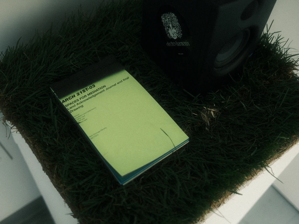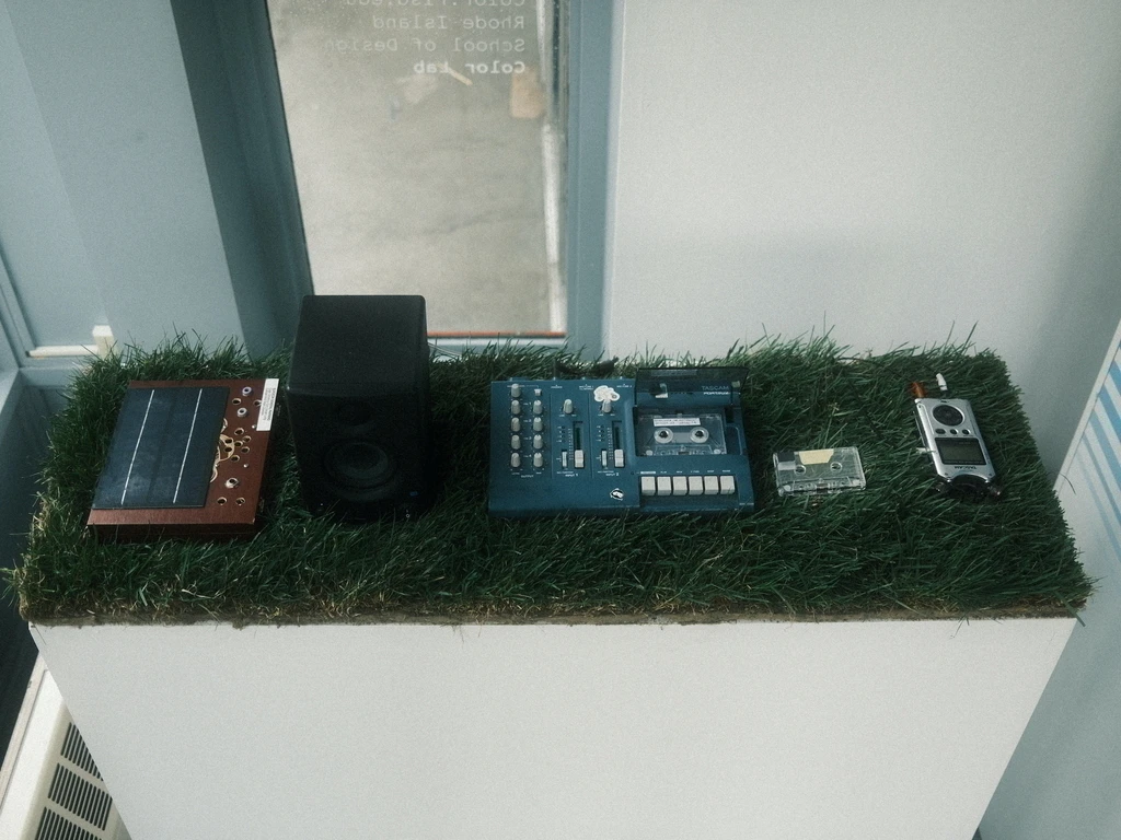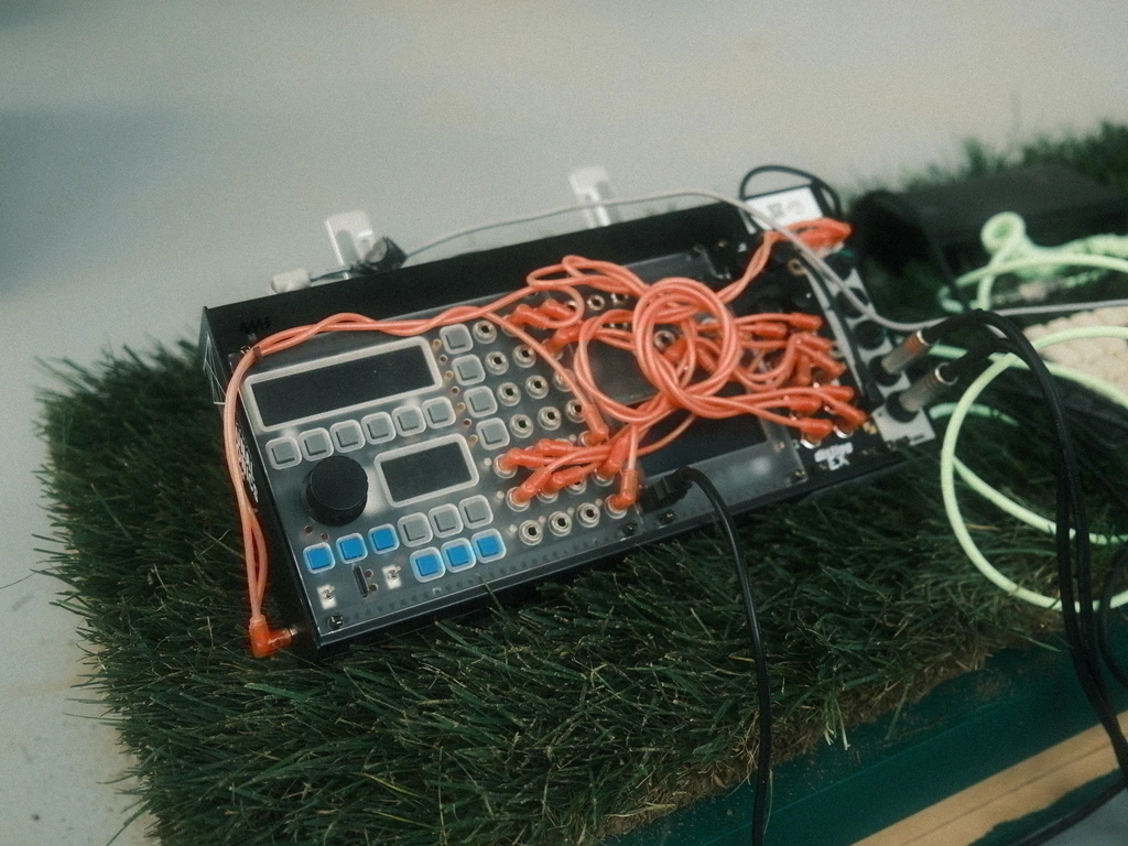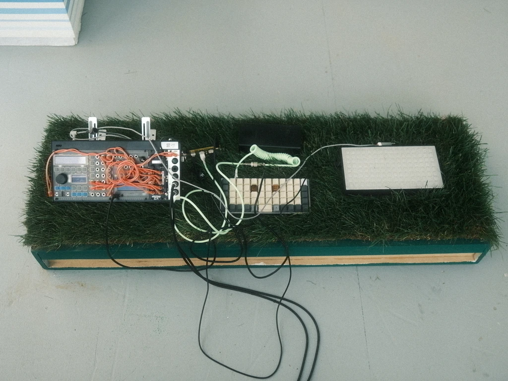 I presented my work as an installation and sonic performance where I placed real grass in between all electronic musical instruments (my modular synthesizer and speakers) and the ground, creating a filter between the electronic and the organic, a filter between the new, grass as regrowth and generativeness, and the land itself. I processed and manipulated existing authentic Lenape music using Teletype (a live coding eurorack with its own syntax, voltage followed from the amplitude of the incoming Lenape songs informed and was translated into binary, whose values were converted to digital pulses and slewed voltages to trigger and manipulate the granular algorithms controls). This performance was not only a presentation of my land acknowledgment and research but a ritual practice in itself and a representation of the history of music culture through creative computation.