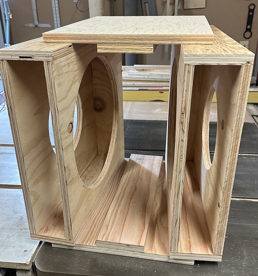 The cloud speakers are done! This was a wild learning experience. I was super excited when the crossover came in to set it up. I did a lot of testing at 4ohms with the crossover around 290 for the bass and 2400 for the mid to tweeter, and at 8 ohms with the crossover for the bass around 300 and the tops around 3400. I decided to stick with running the speakers at 4 ohms. One of the immediate things i noticed was that there wasn't enough bass at all. This could be because the bass drivers I was using were 4 ohm, and the mid ones were 8 ohms and covering a wider range, but also because the mid drivers were open back and the subs were enclosed, so you're getting twice as loud of a sound coming out of the mid range drivers. I added two power resistors, whatever I had lying around in the studio to the back of the mid range drivers to make them about 10db quieter which helped but they still feel loud and I don't think ill get much out of these cheap 10in bass drivers, so I'm leaving it where it is for now, and maybe ill add another resistor in series to the back if its too mid heavy. That said, there is a lot of clarity in those mids, not so much in the highs, I wish i had used compression drivers or added a piezo or super tweeter to get up to 20khz, but this is the gonzo build. It just needed to happen and now its done. They sound great! I have a lot of ear fatigue from lots of listening so I'm going to take a break from them, listen to them in new spaces and ask for peoples opinions on ho they sound so I don't feel crazy.