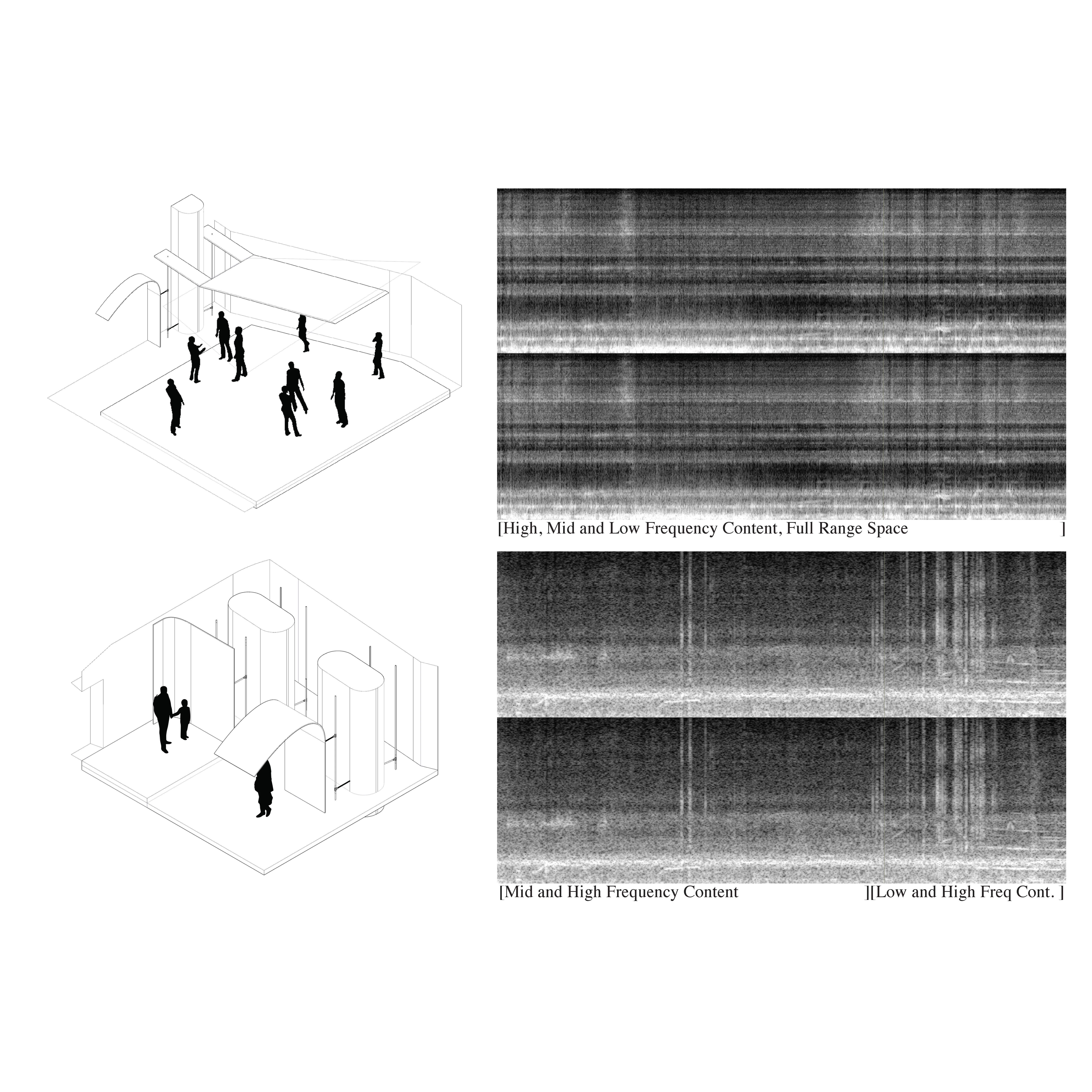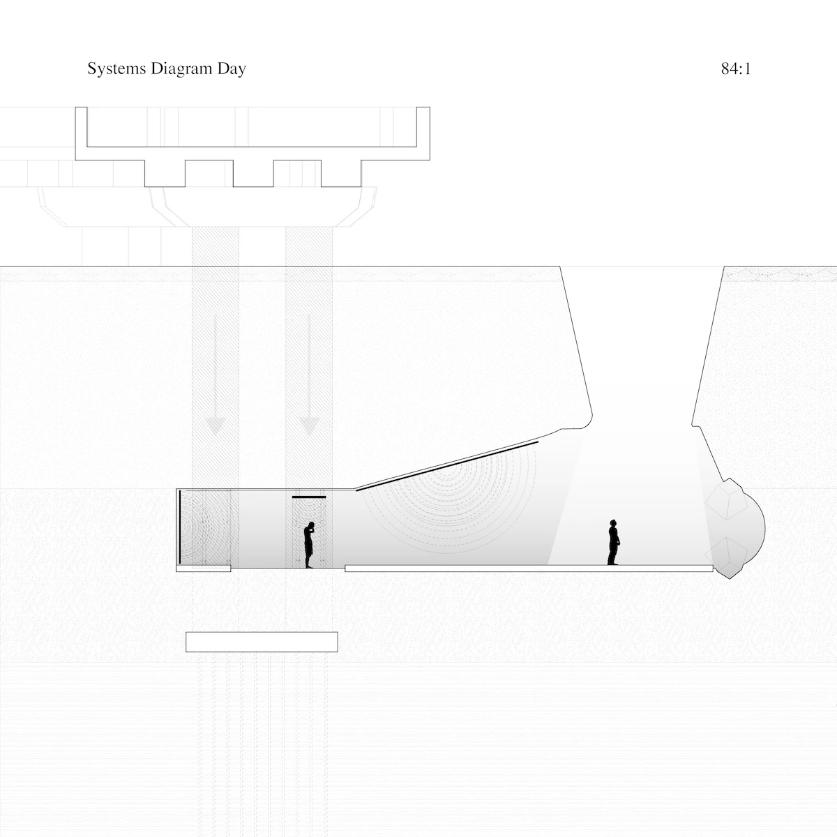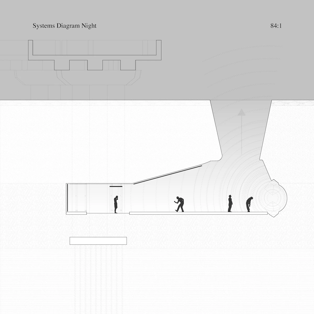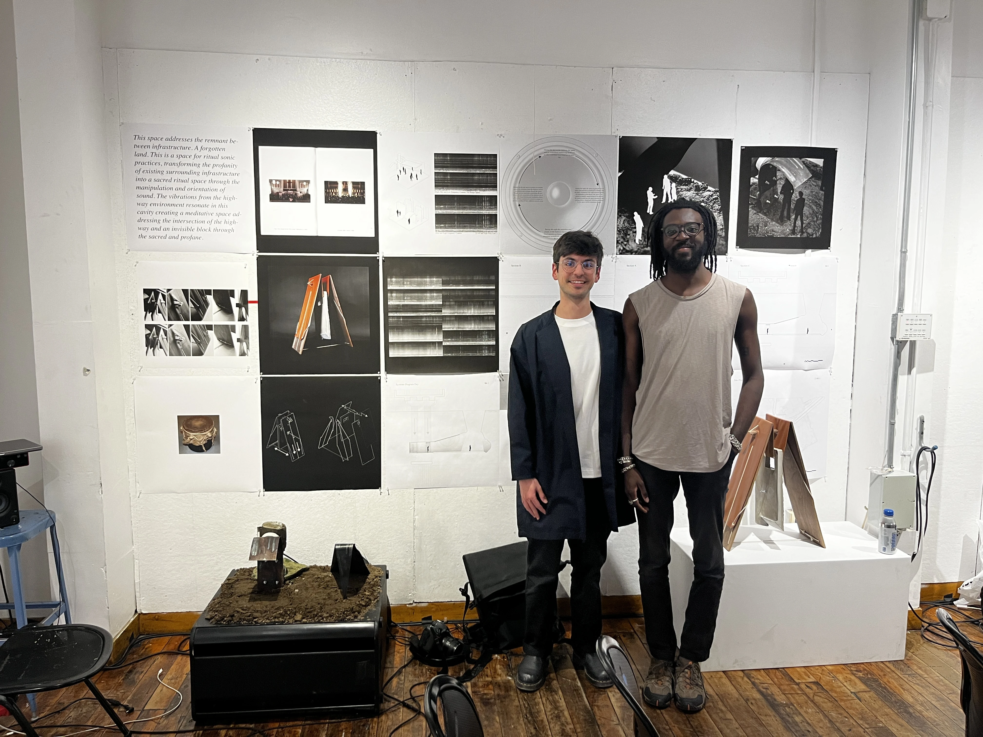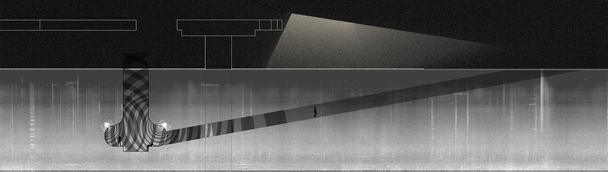 This space addresses the remnant between the circadian. a space for ritual sonic practices, transforming the profanity of existing surrounding infrastructure into a sacred ritual space through the manipulation and orientation of sound. The vibrations from the highway environment resonate in this cavity creating a meditative space addressing the intersection of the highway and an invisible block through the sacred and profane. In act 1 me and jay explored the sacred and profane though the dichotomies between club culture, church and religion in their symbolic and ritualistic intersection. During act 2 I Began to explore different ritual practices connected to sound and meditation, specifically the Lenape water drum and how meditation circles are structured to bring community together through sound and the body. The structure of the closed loop both symbolical and structurally influenced my artifact. In my artifact I explored ideas of skin, the body and preservation through natural and man made material studies with the use of leather concrete and wood. Thinking about the symbolism of the church in its sacredness and the profanity of underground music and counterculture music through the preservation of concrete as the preserved object. This artifact is a preservation of both the ritual practice of meditation and of the underground and profane. Structurally I was thinking of the closed circle, the way the communities of the sacred and profane hold each other together, each ritual is individual and self sufficient. When choosing a site for act 3 I was exploring the sonic properties of different spaces and a came across a patch of grass surrounded on all sides by highway infrastructure that I was instantly drawn to. The space connected to the idea of profane spaces as it was neglected, almost invisible but preserved in its blandness because of its location. In experiments exploring the sonic propertied of the materials in the landscape vibration became a very important element in the design process. The vibrations from the highways transmit sound into the space through the concrete of the highway columns, steel pipes and soft soil. I learned through taking sonograms of my recordings that high frequencies are transmitted though steel, resonant mid range frequencies are transmitted though concrete and low frequencies are transmitted mostly though soil. I then made small scale models where I played field recordings of the space and of the vibrations from the highway though their respective materials to think about how I can orient sound in the space, and transform the profanity of the highways into a sacred ritual and meditative space. I began excavating the neglected plot as to submerge the space into the soil. The columns from the highway protruding through the spaces to bring sound into the space, and the large aperture to bring out of the space became an important part of the design as it presented a ritual cycle of listening and performance, meditation and amplification receiving and transmitting. My material studies informed the program as various spaces within the excavation will sound different, with the main space translating full range sound from the highway. During the day the space is a place for meditation as the vibrations from the highway will be transmitted and resonate though the space though various materials, translating the profanity of sonic properties of the highway into a space for deep listening and meditation. Each material has a purpose in creative a unique experience as they all have different acoustic properties. During the day on the highway the space acts as a threshold unknowing of drivers as they contribute to a ritual act in passing. During the night, the space is open for use of other sonic practices produced by humans and the body, constructed with soffit mounted speakers embedded in the design, the space is designed to amplify sound produced by and for the underground upwards into the existing environment. During the night the passerbys and people on the highway engage in the ritual practice as listeners as sound is amplified acoustically and directionally by design. The design of overground and underground interaction addresses the intersections of the sacred and profane through vibration and acoustics, and creates a sacred and preserved space for both parties. Over time as this space is used through the nature of natural materials and vibration the acoustic propertied of the space and the way the space sounds will begin to morph and change over time. Ideally the space will never sound the same, making every ritual interaction with the space unique and personal, until the space is in a state that makes the space more profane than sacred in that it is not in use and becomes a part of the existing environment, the space is not allowed to be repaired in any way.