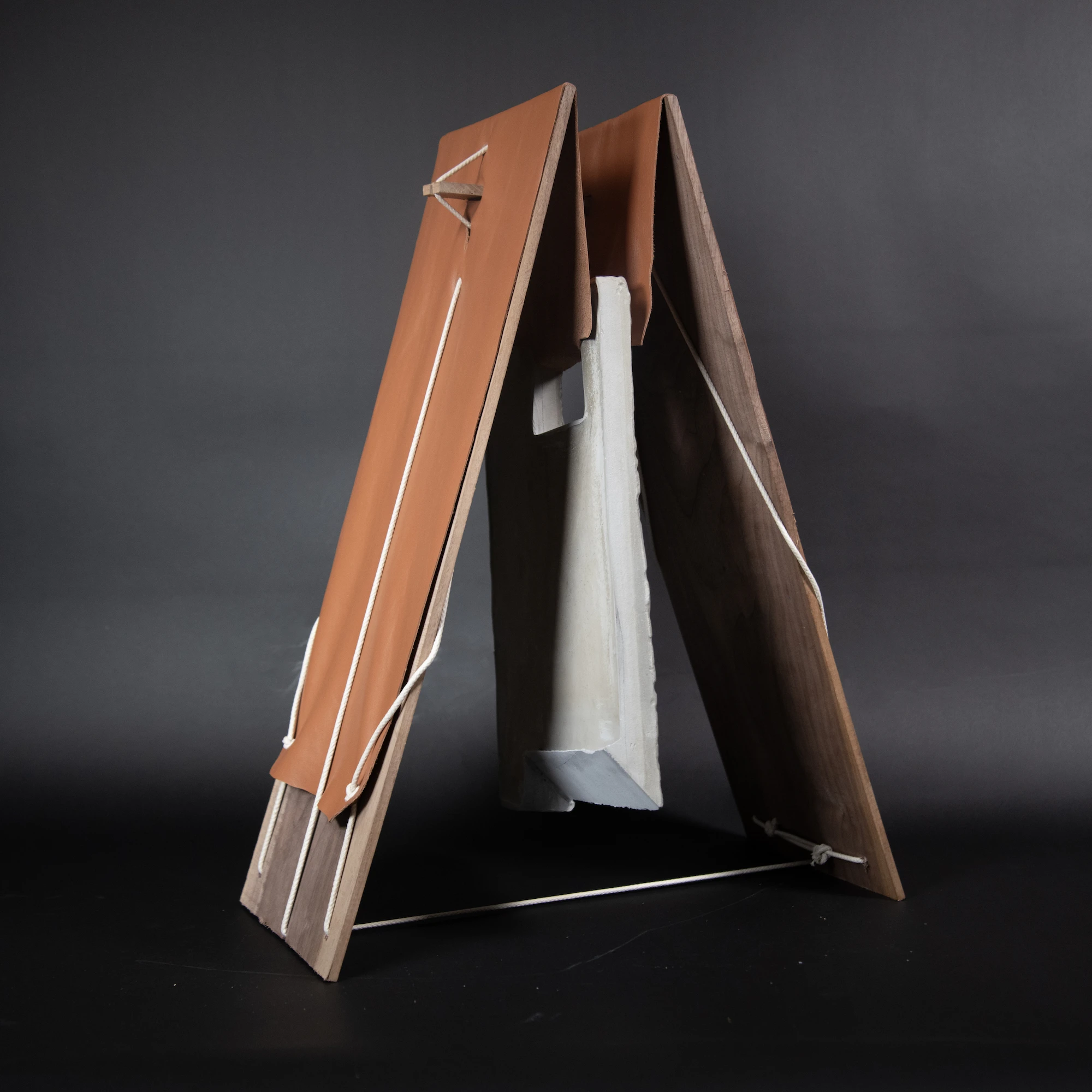 Building in research on the idea of sacred and profane, this ritual object is a representation of indigenous drum circles and adjacent customs and ritual practices. The materiality is a direct symbolism of the body (wood) and skin (leather). The shape is a shrine, a spiritual/holy space, a form of archiving, a vessel, a body, a temple. The preservation and acknowledgment of concrete is a symbol of the dichotomies between ritual practice and modern day sound system/club culture, with particular homage to warehouse raves and the use and abstraction of existing concrete structures as ritual as collective dance is a ritual practice. communities hold themselves together with simple bindings/shared experience, material propitiates of of leather, they are mailable natural and ever changing shapes.