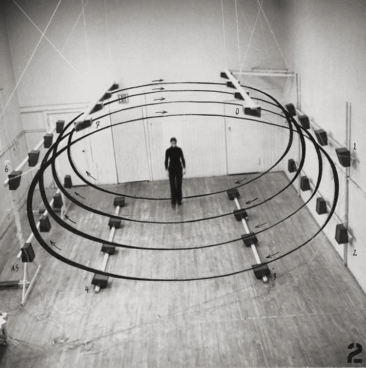 Bernard Leitner uses analog electronics to pan sound through speaker drivers around a room with a specific trajectory. This interaction between sound and space is really interesting to me. The idea of transforming space visually with these paths, simplifying movement and program of spaces to single lines or gestures such as the spiral in this image. I'm inspired by the clarity of this work, the sound aspect, drawings, paths and experiences are very clear from the images and documentation. I hope to document my work similarly.