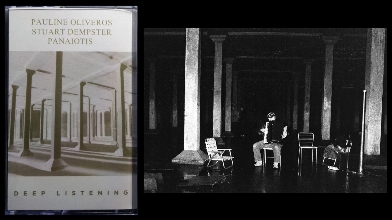 Deep listening is the practice of listening closely to all the layers of sound in your environment at all times, really focusing and trying to discern the individual sounds. This is a practice in meditation, improvisation and conciousness. Pauline in 1988 preformed as a part of this practice of deep listening, in an underground cistern in Fort Worden, Port Townsend, Washington. A huge space with a 45 second reverb. This space shaped and morphed the performance, inviting an abstracted stretched elongation of the sound preformed, filling the space sonically into a bed of sound and ambiance. This focus on using the architecture of spaces to create ambiance, the architecture being a crucial part of the composition, is the relationship I'm interested in exploring more in my work.