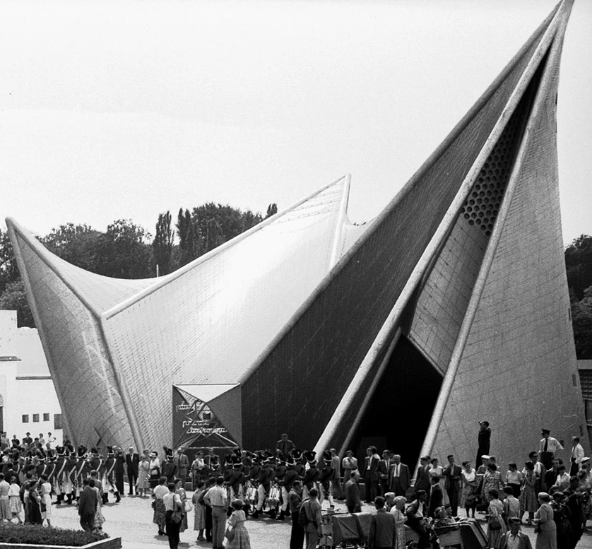 The Phillips Pavilion at the Brussels World Fair in 1958 where Iannis Xenakis performed Metastasis, An audio/visual experimental sound performance involving hundreds of speakers and lights.