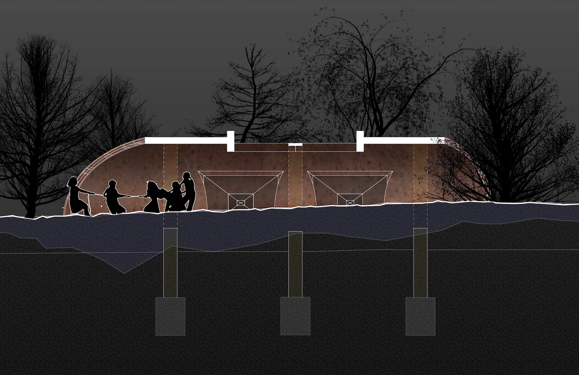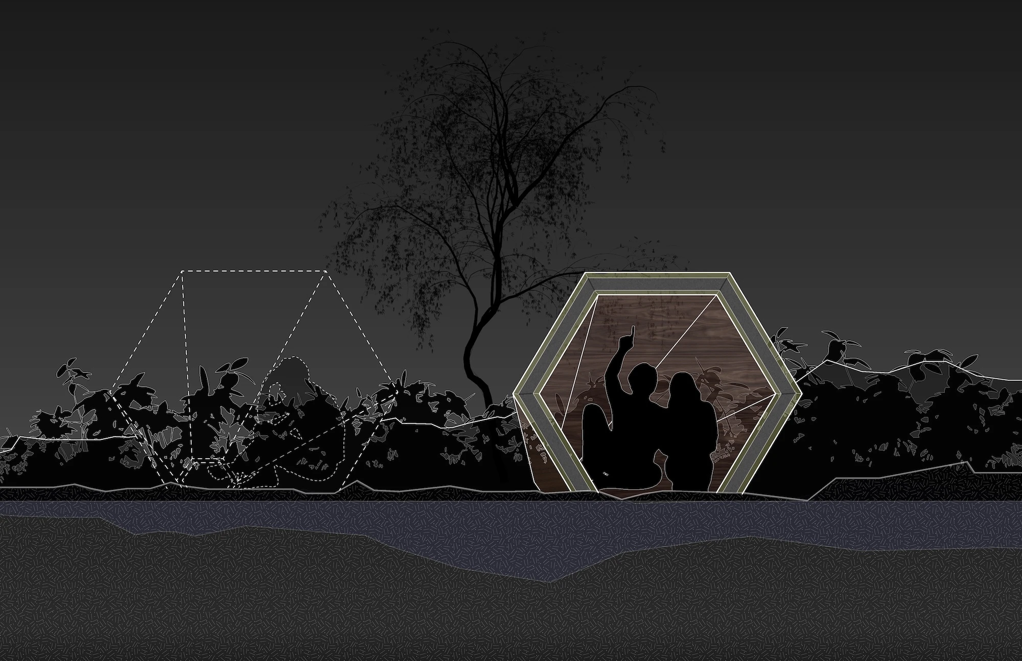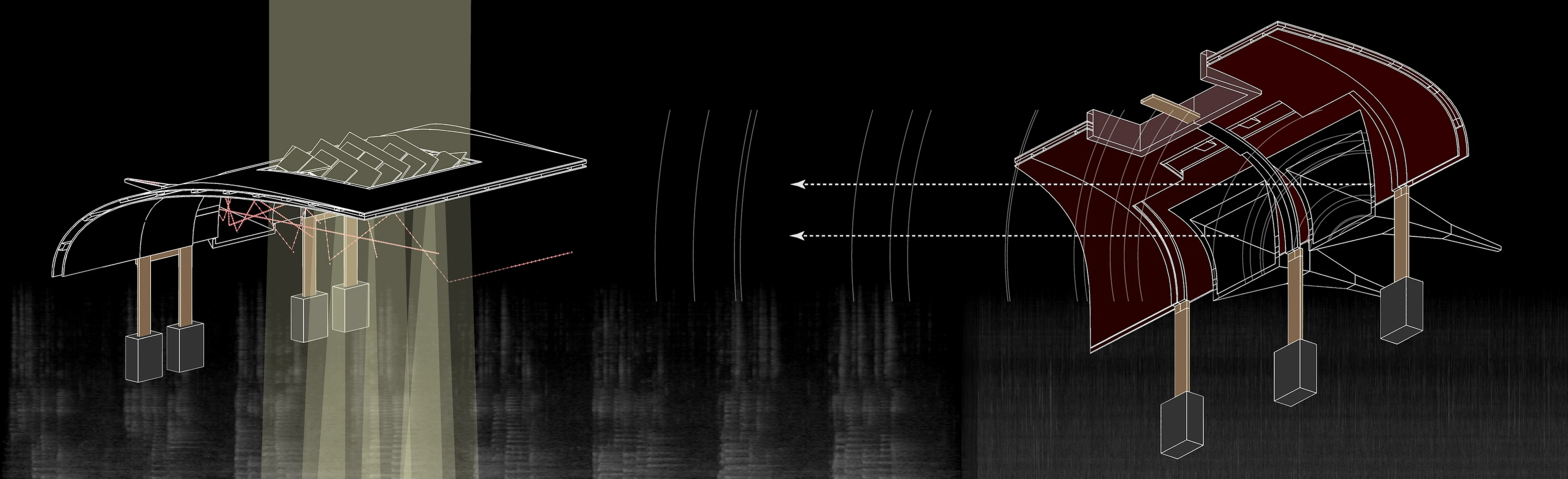 The speaker horn creates an enclosure for acoustics, directly amplifying the sound of the river passage on its journey, in its loud and quiet moments. The pavilion creates a ritual space for sonic exfoliation. A place for ambiance and meditation, for performance and research. With no direct program, the sound and environment inform actions taken in the space. With both passive and active horns, the sound of water, the environment, and human interaction are amplified to reorient and intervene the user as well as nature and the surroundings infrastructure.