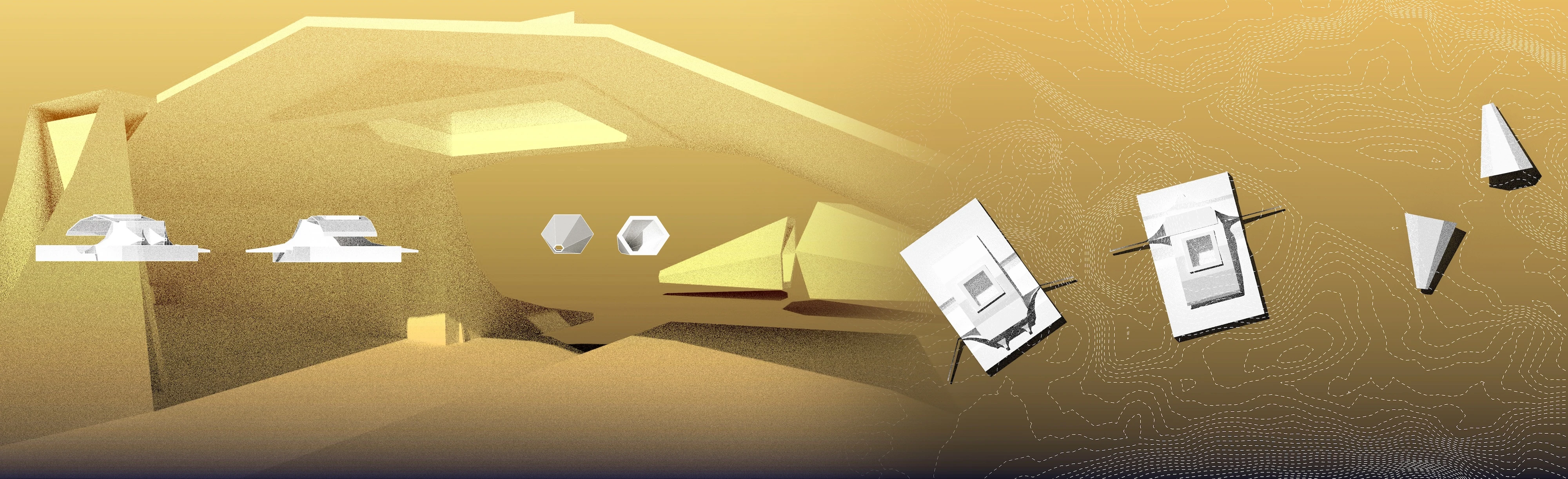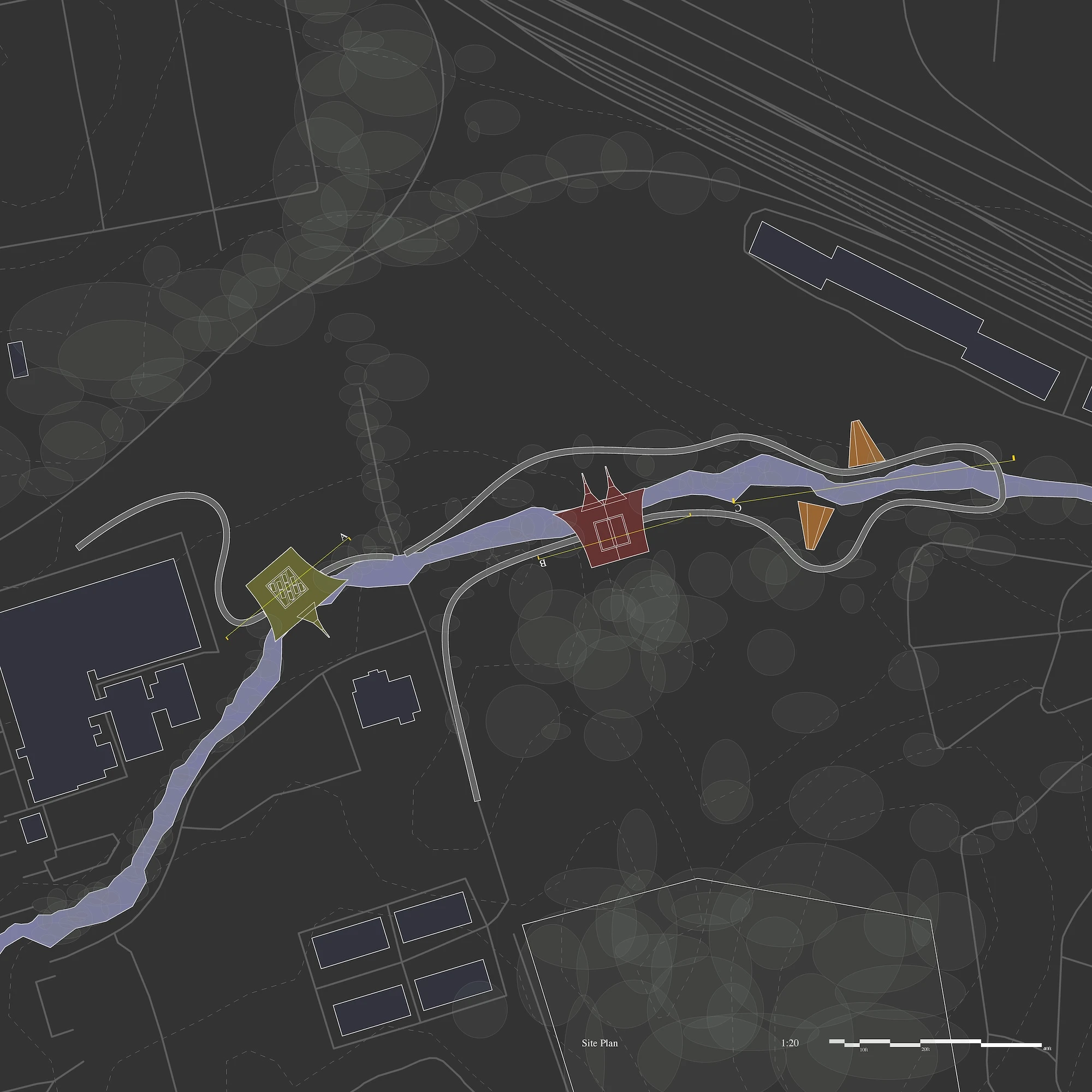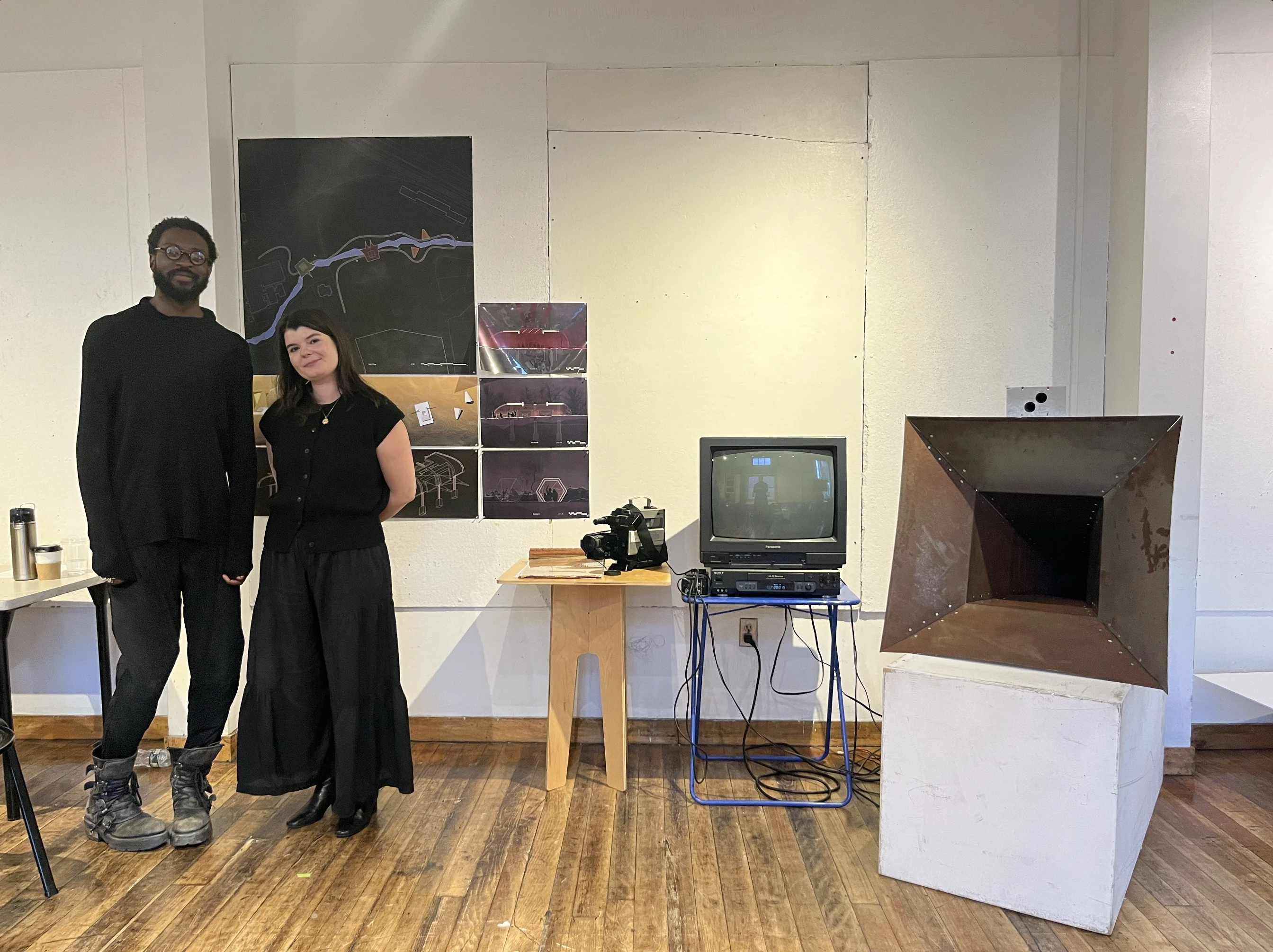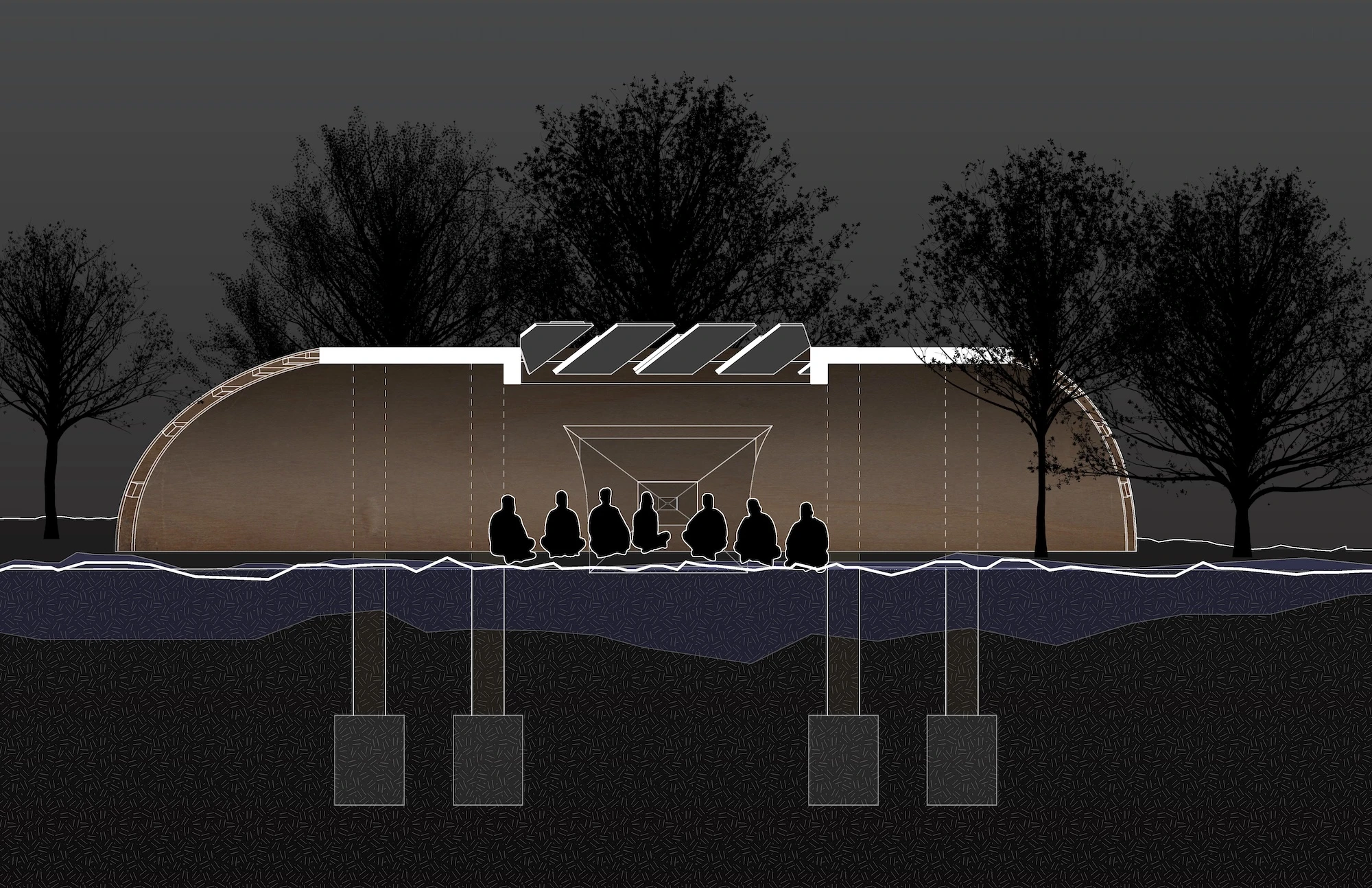 The speaker horn creates an enclosure for acoustics, directly amplifying the sound of the river passage on its journey, in its loud and quiet moments. The pavilion creates a ritual space for sonic exfoliation. A place for ambiance and meditation, for performance and research. With no direct program, the sound and environment inform actions taken in the space. With both passive and active horns, the sound of water, the environment, and human interaction are amplified to reorient and intervene the user as well as nature and the surroundings infrastructure.