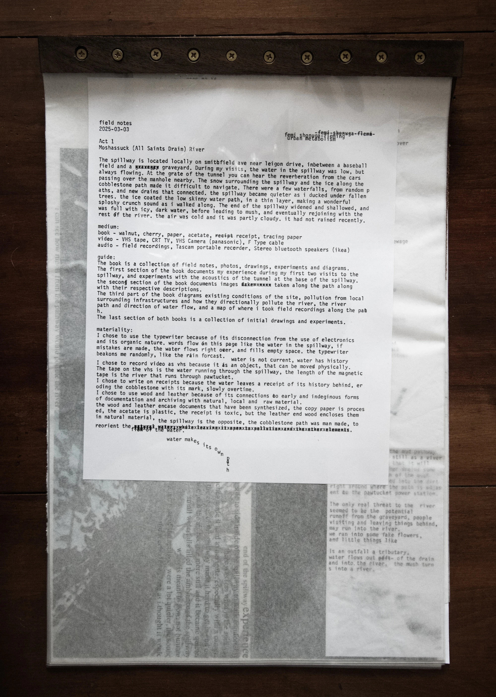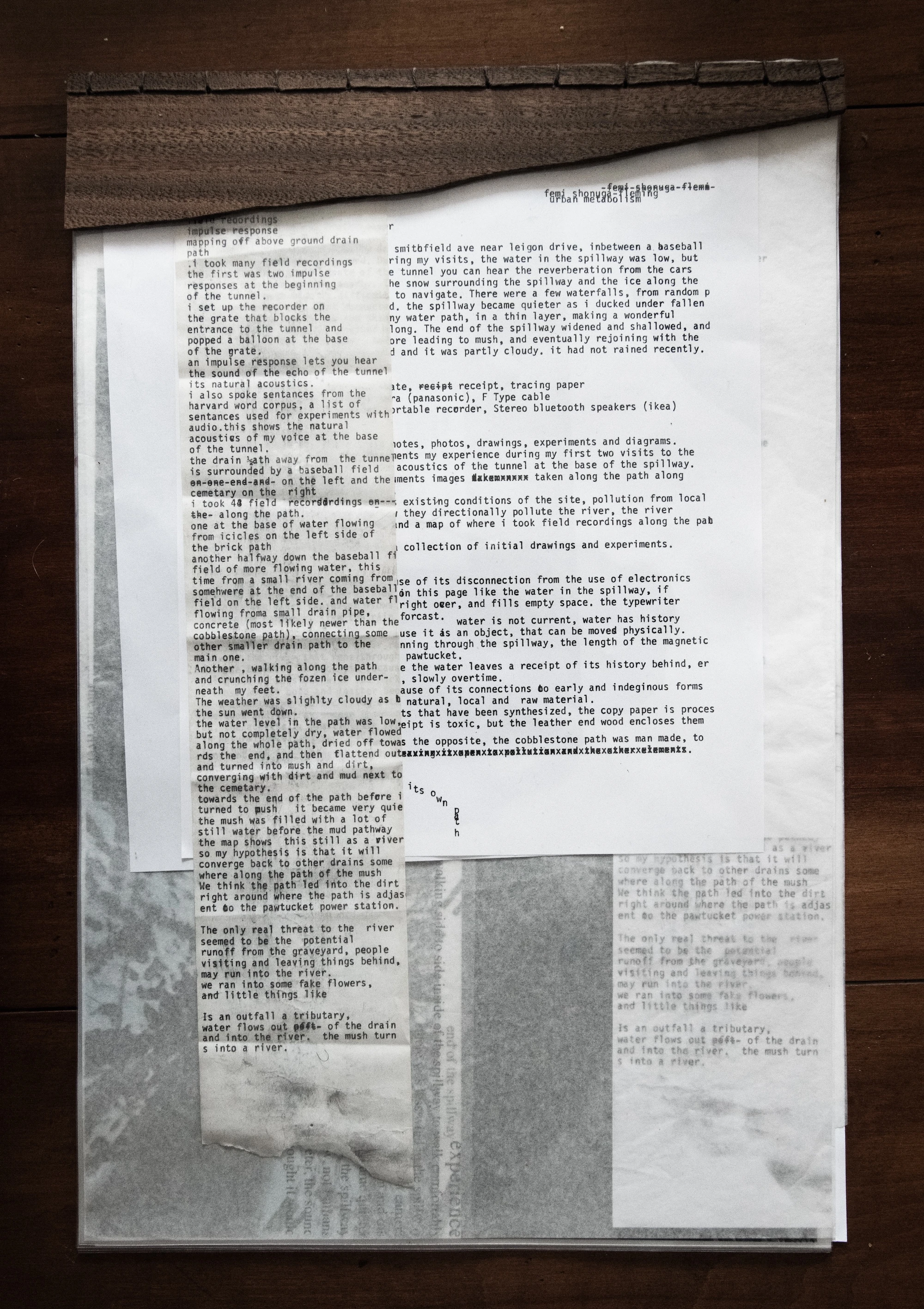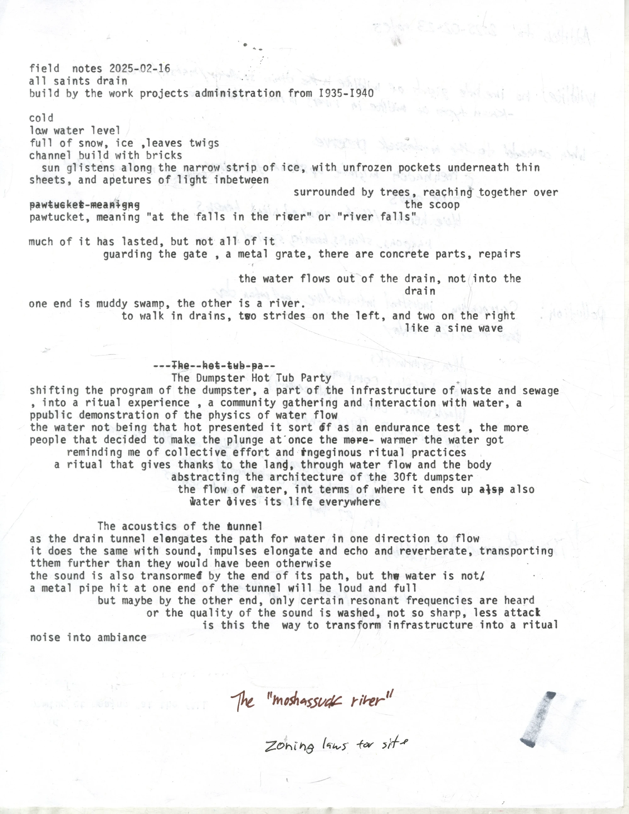 The spillway is located locally on Smithfield ave near Legion drive, in between a baseball field and a graveyard. During my visits, the water in the spillway was low, but always flowing. At the grate of the tunnel you can hear the reverberation from the cars passing over the manhole nearby. The snow surrounding the spillway and the ice along the cobblestone path and made it difficult to navigate. There were a few waterfalls, from random paths, and new drains that connected. the spillway became quieter as i ducked under fallen trees. the ice coated the low skinny water path in a thin layer, making a wonderful sploshy crunch sound as I walked along. The end of the spillway widened and shallowed, and was full with icy, dark water, before leading to mush, and eventually rejoining with the rest of the river. the air was cold and it was partly cloudy, it had not rained recently.